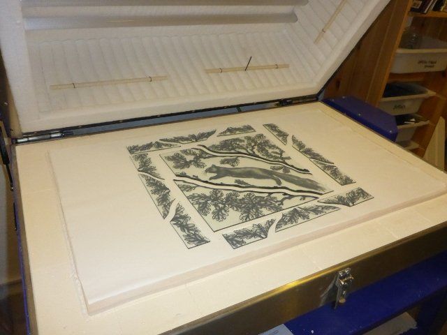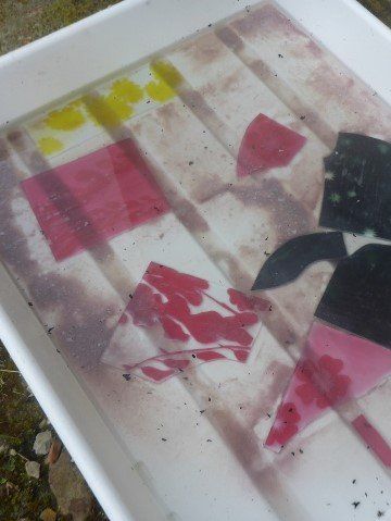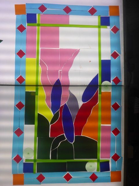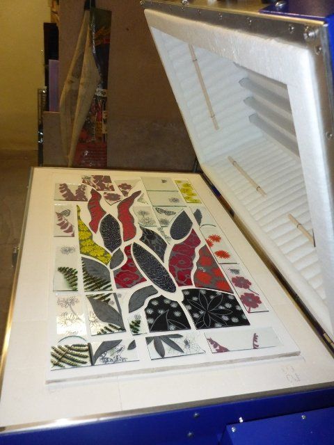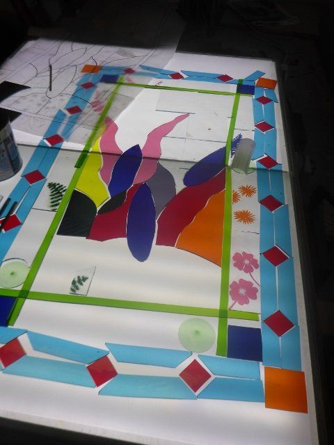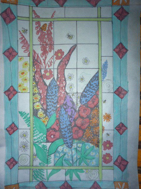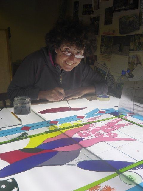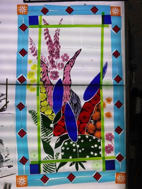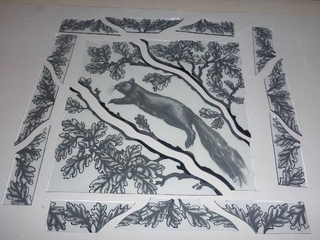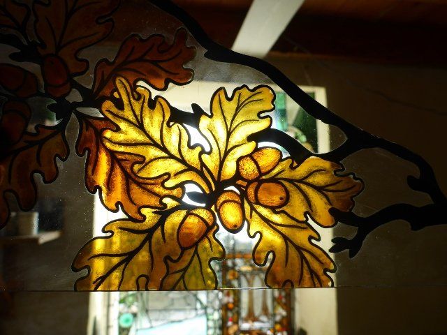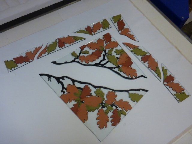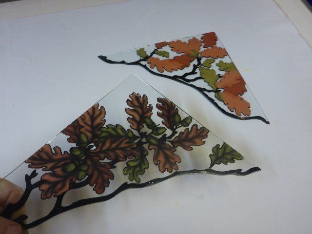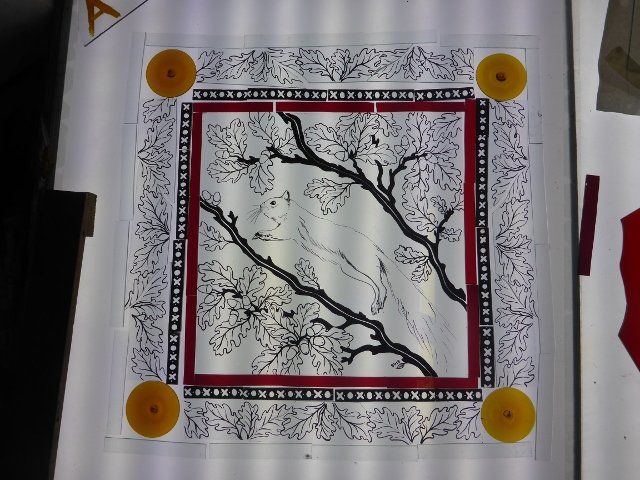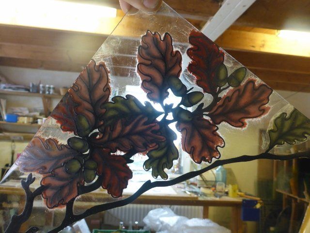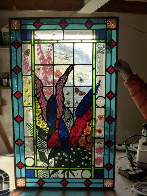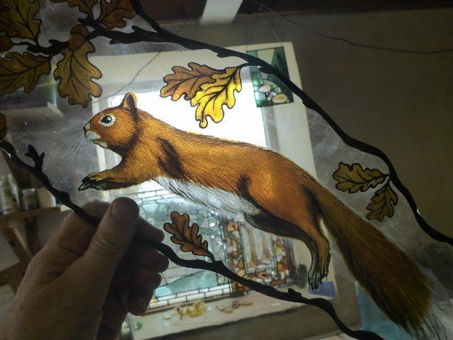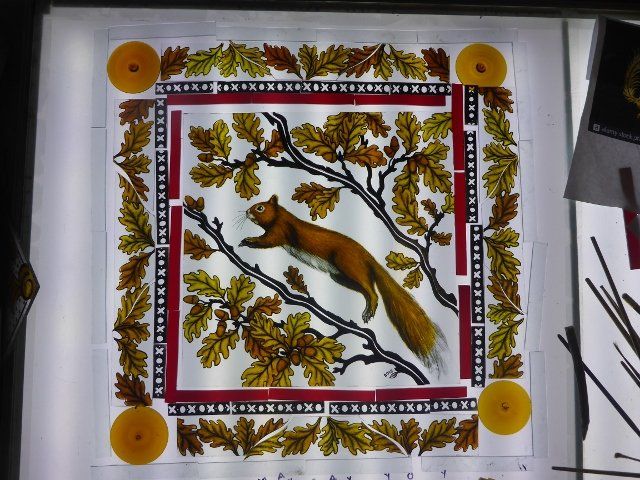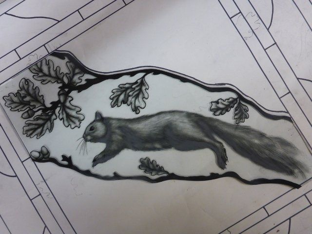 A lot of work goes into making a window. The design must be drawn up to scale, the individual pieces cut out, etched and painted as required, then everything has to be leaded together, soldered and cemented. Some pieces are cast in glass, leaving imprints of real objects.