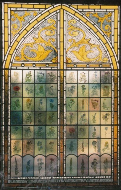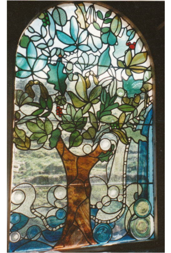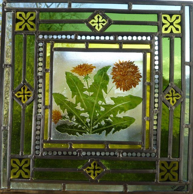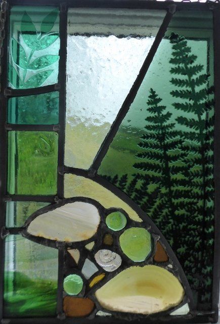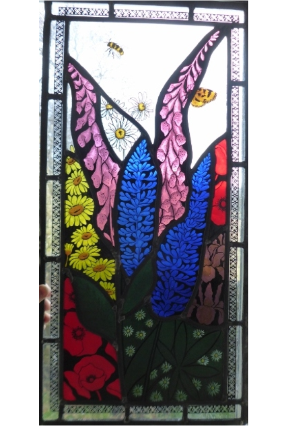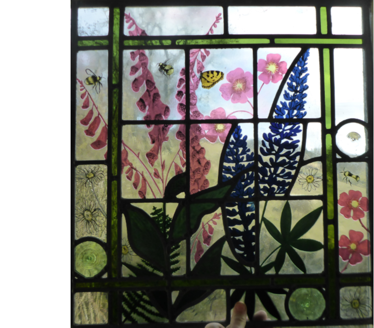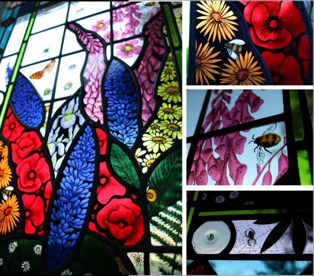 Details from a window made for a friend. The flowers and insects were painted and etched.