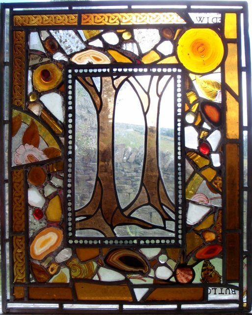 The window this was made for was once a barn door. Catseyes were used to create stars that only show up in the dark.
